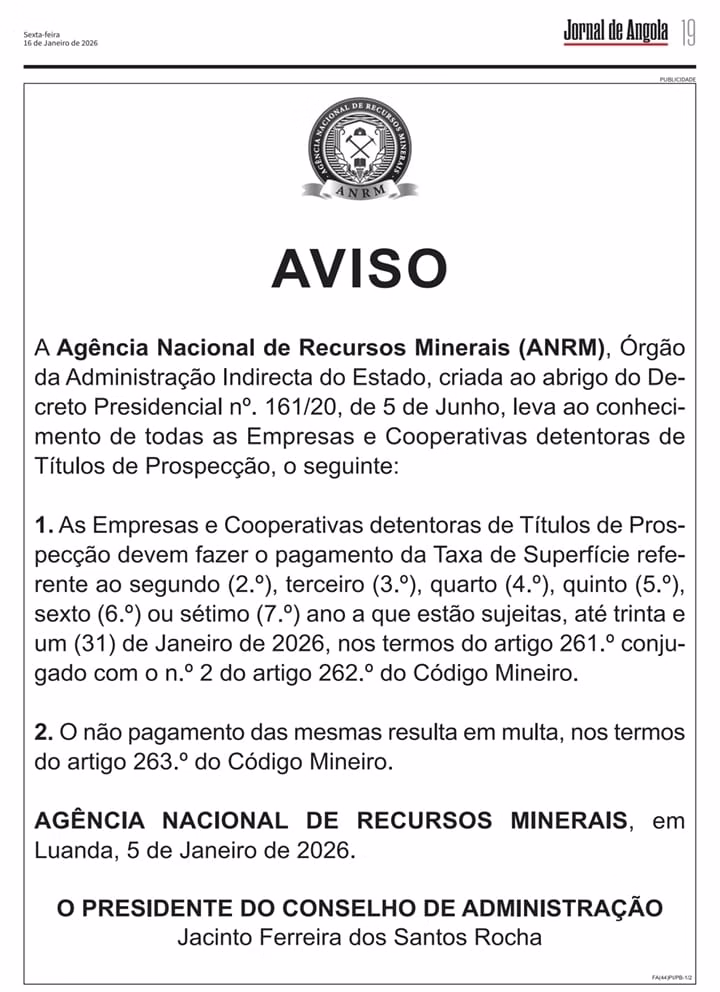 AGÊNCIA NACIONAL DE RECURSOS MINERAIS, em Luanda, 5 de Janeiro de 2026.